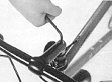 ●握把的固定为了防止骑行当中握把脱落或者旋转,用粘合剂粘住握把,或者用铁线拧紧固定。剪断铁线时余留1cm左右,并把它插进握把内。●握把的装卸假若握把扭得过紧,无法解开时,把水注进握把与杆之间,或者用空气压缩机,向握把侧的孔内压入空气,增加握把的内压,注入空气要封住另一侧的握把的孔。 假若握把己经很陈旧,不再使用时,用刀把它切开,但要小心不要弄伤杆。 |